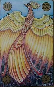 A képen egy Főnixmadár látható, melynek fontos a szimbolikája. Ez a lélek madara, aki élénk, narancsos színű szárnyaival éppen felemelkedik a hamvaiból. Alatta egy szétrombolt világ, amiben már nem tud tovább létezni. Feltámad és újjászületik.