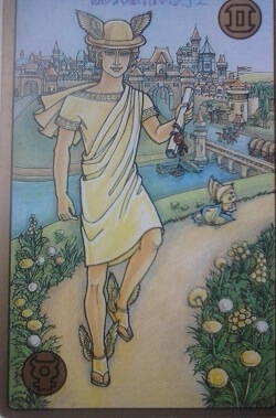 A képen egy fiatal férfi látható, akinek angyali szárnyai vannak. Lehet ő akár egy őrangyal is. Maga mögött hagyva a várost előre halad egy virágos úton, kezében egy lepecsételt papírtekerccsel. Pillangók kísérik az útján.